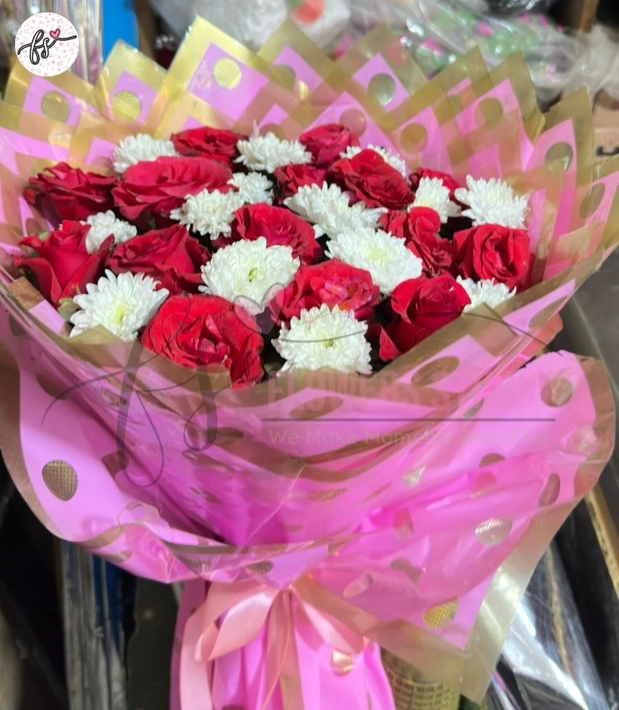 A romantic blend of red and pink roses with white flowers, arranged beautifully in soft pink wrapping – high quality with an affordable price, ideal for heartfelt gifting.