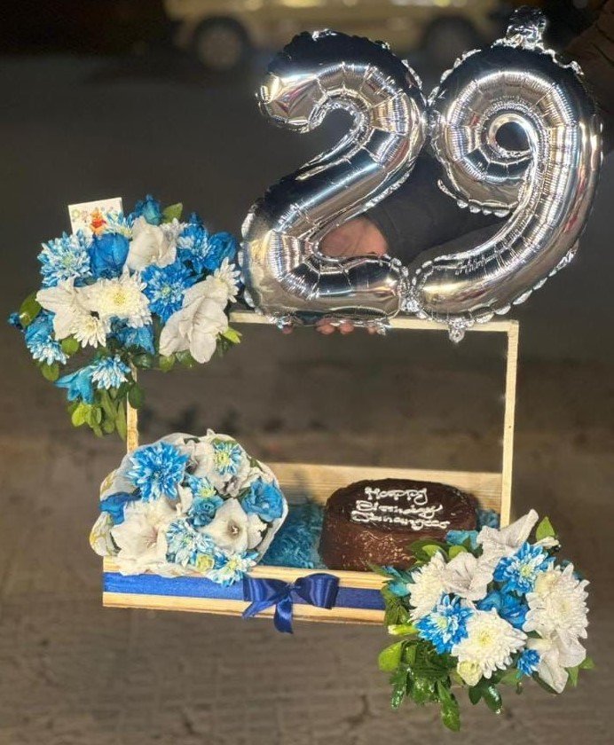 Make birthdays unforgettable with this stunning gift basket that combines a fresh blue and white flower bouquet with a delicious chocolate cake and personalized birthday balloons. The basket also features elegant flower arrangements on the handle, creating a complete, visually striking gift. Crafted with high quality at an affordable price, this bouquet and gift combination is perfect for celebrating milestones like 29th birthdays or any special occasion with a personalized touch.