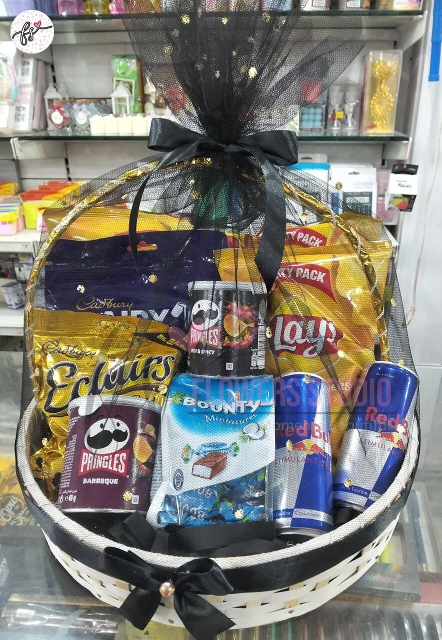 Surprise your loved ones with this thoughtfully curated Chocolates & Snacks Gift Hamper Basket. It includes popular chocolates, Lays, juice, and other tasty treats, all arranged in a stylish gift basket. Crafted with high quality at an affordable price, this hamper is perfect for birthdays, anniversaries, congratulations, or any special celebration. Ideal for customers looking for a ready-to-gift combination of treats and elegance in one premium package.