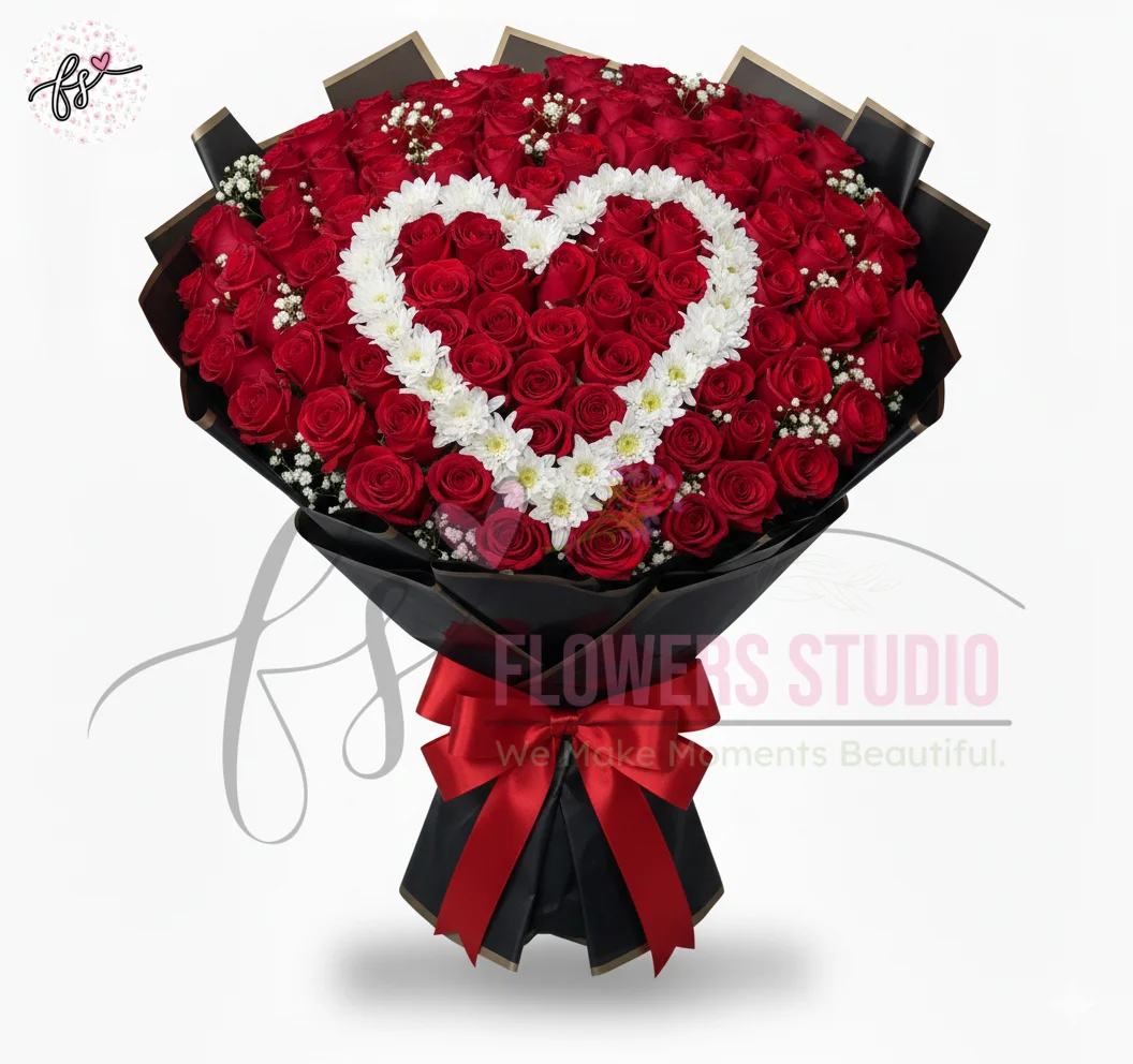 The Crimson Heart Circle Roses Bouquet White Craze Wrap Faisalabad is a stunning romantic floral arrangement featuring fresh red roses arranged in an elegant circular heart-inspired design. Wrapped beautifully in stylish white craze wrapping, this bouquet is handcrafted by Flowers Studio in Faisalabad to create a bold and luxurious gifting experience.