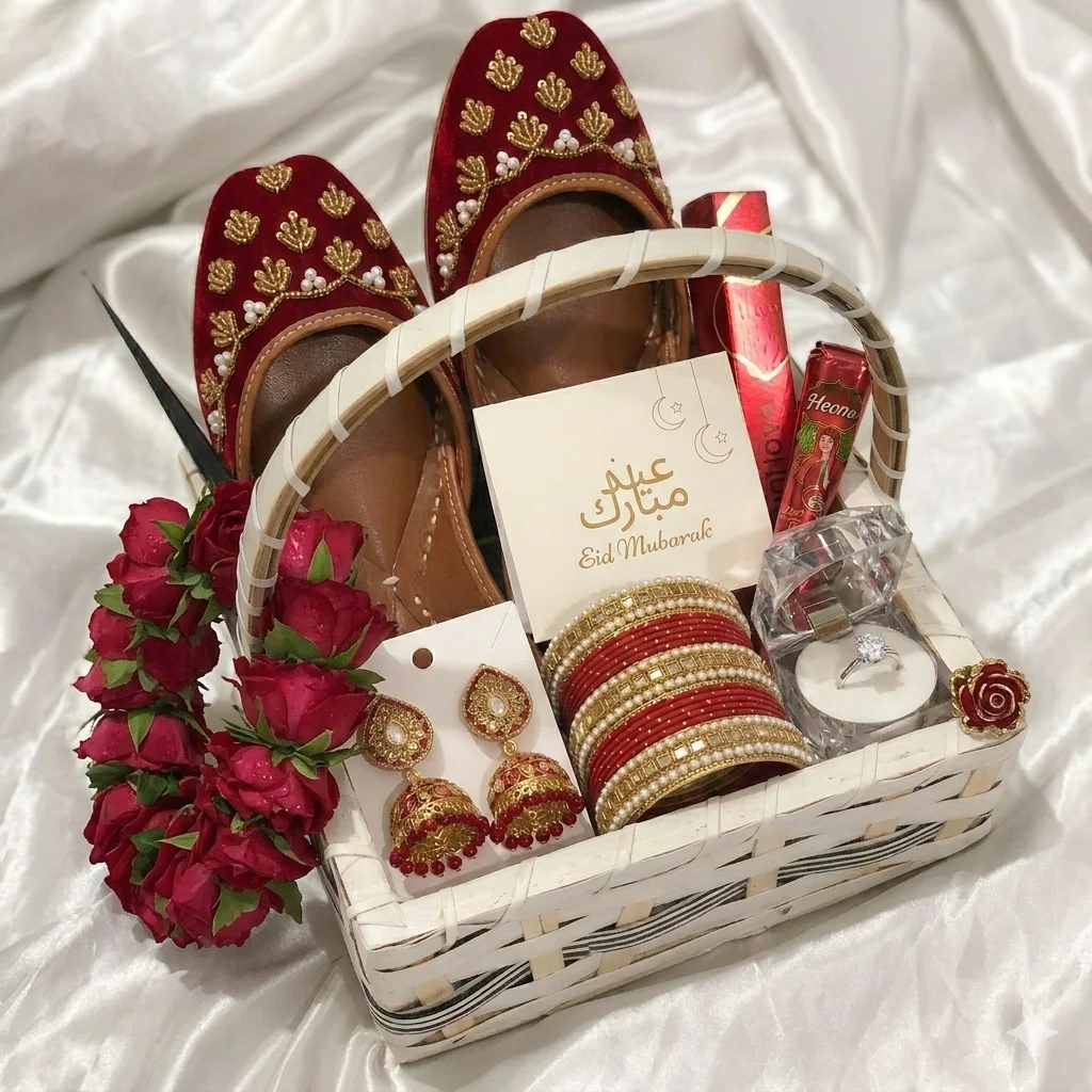 Eid Special Eidi Gift Basket for Her including khussa, earrings, ring, premium bangles, mehndi cones, and fresh red rose gajras β a complete traditional Eid surprise at high quality and affordable price.