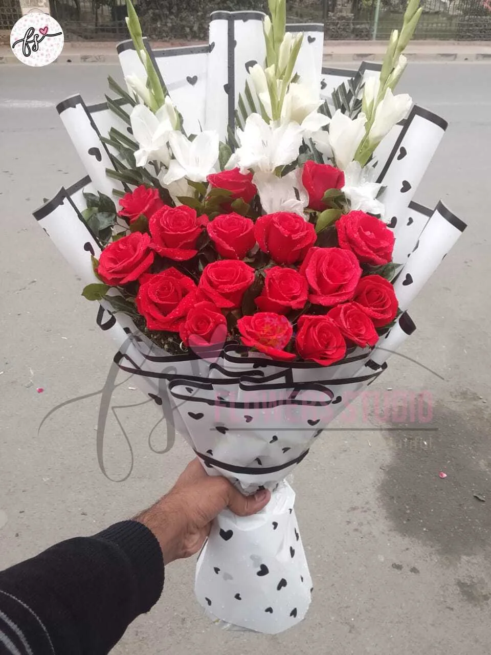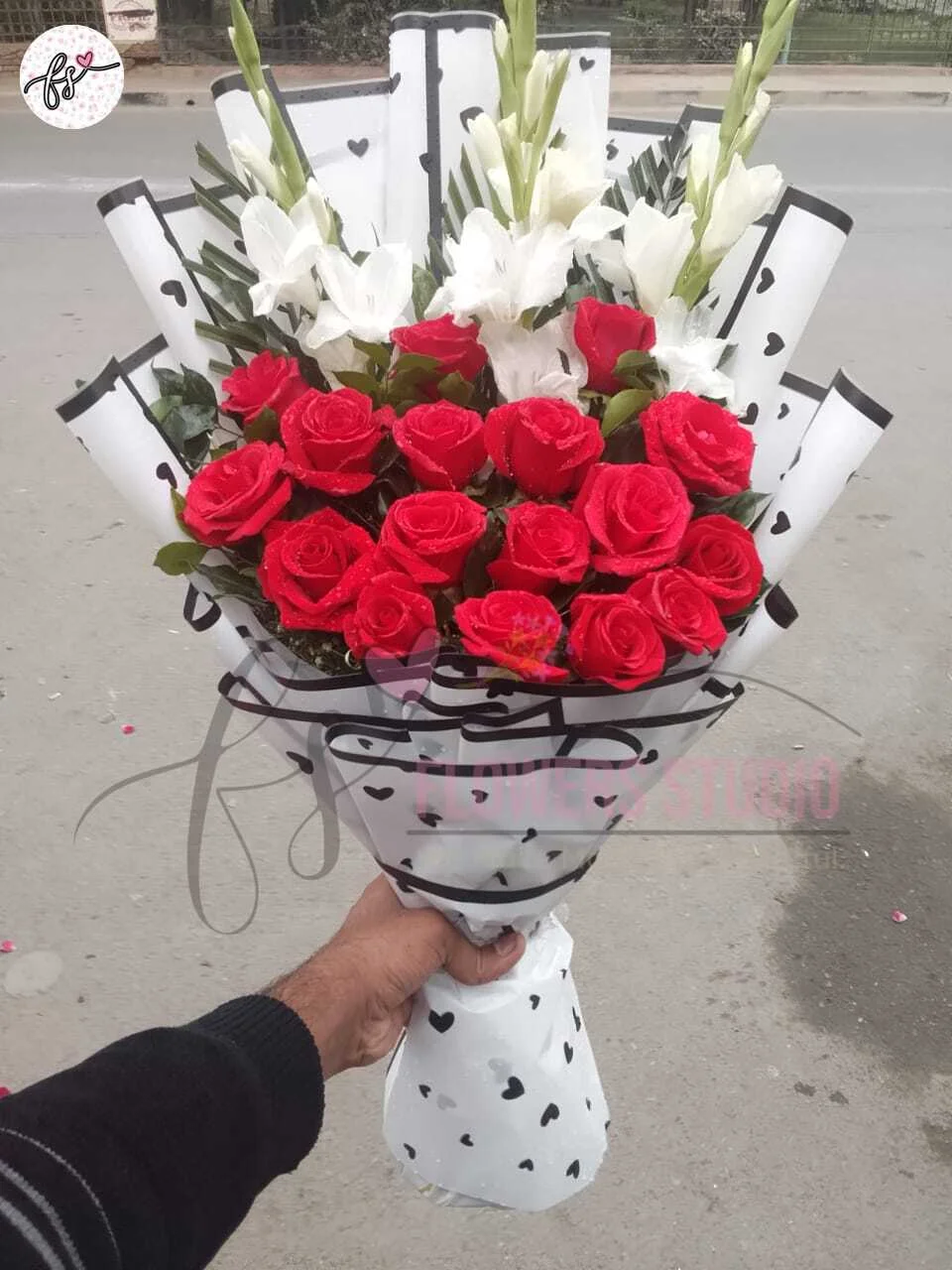 The Elegant Red Roses and White Gladiolus Bouquet Faisalabad is a stunning floral arrangement featuring fresh red roses paired with white gladiolus, beautifully wrapped in premium white paper. Handcrafted by Flowers Studio in Faisalabad, this bouquet exudes sophistication, elegance, and freshness.