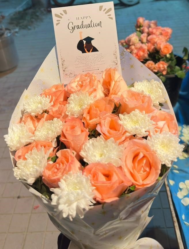 Congratulate your loved ones on their achievements with this vibrant graduation bouquet featuring fresh light orange roses and delicate white flowers. The skin-colored wrapping adds a warm, elegant touch, making it an ideal gift for graduations, academic accomplishments, or special milestones. Crafted with high-quality flowers at an affordable price, this bouquet delivers freshness, beauty, and a joyful presentation that leaves a lasting impression.