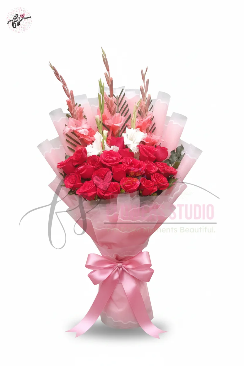 The combination of red roses and gladiolus flowers symbolizes love, strength, admiration, and elegance. This premium mixed flowers bouquet is perfect for anniversaries, birthdays, romantic gestures, surprise gifts, and special celebrations. The soft pink wrapping adds a graceful and luxurious touch, making this romantic flower bouquet a memorable gift for your loved ones.