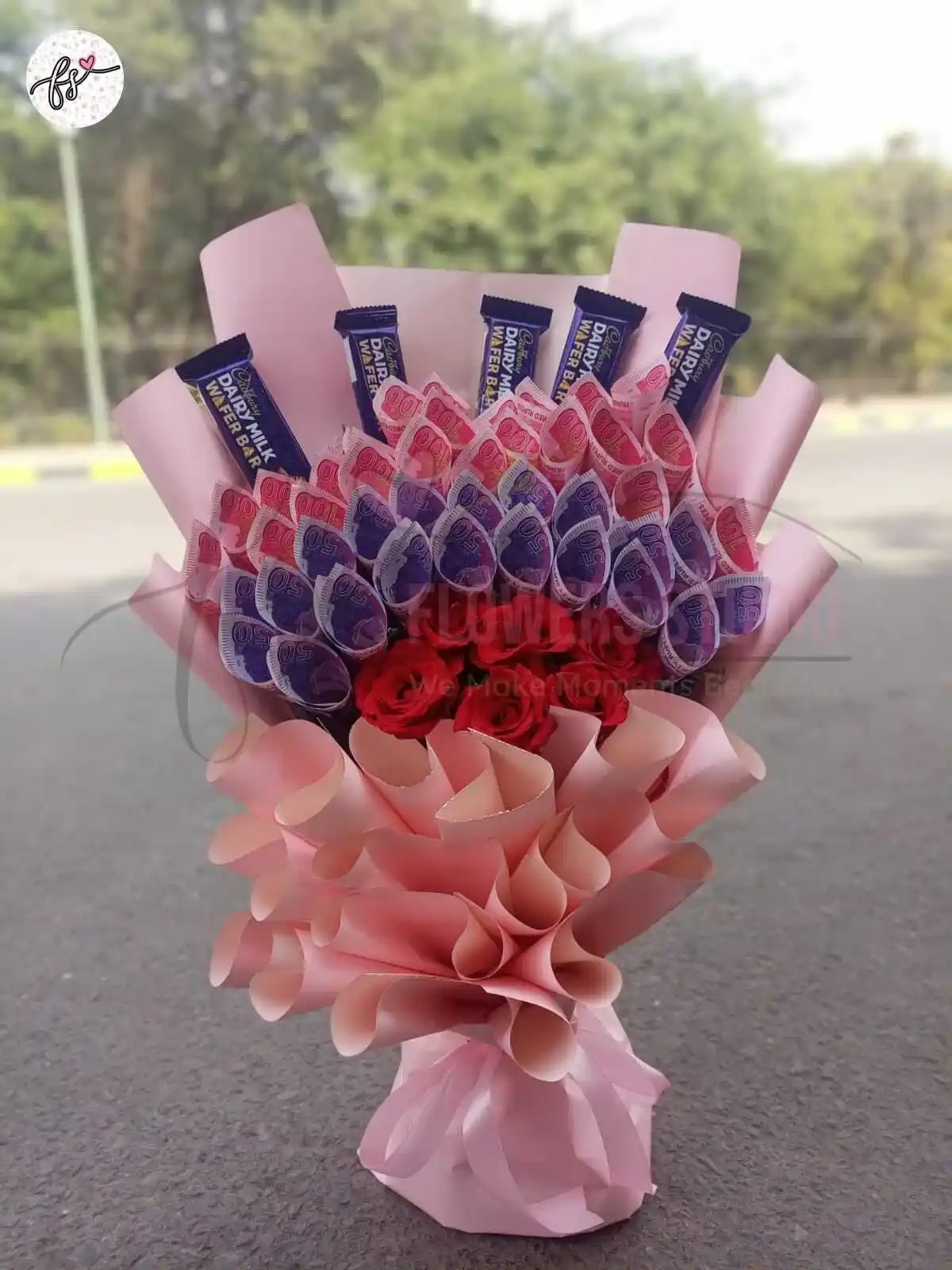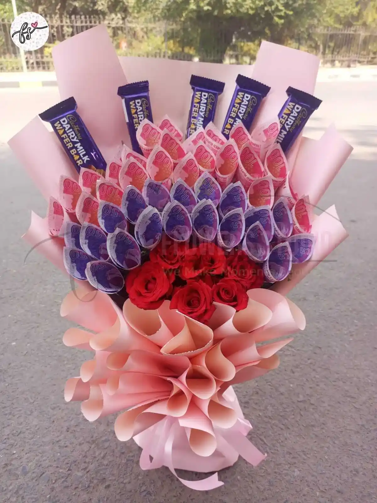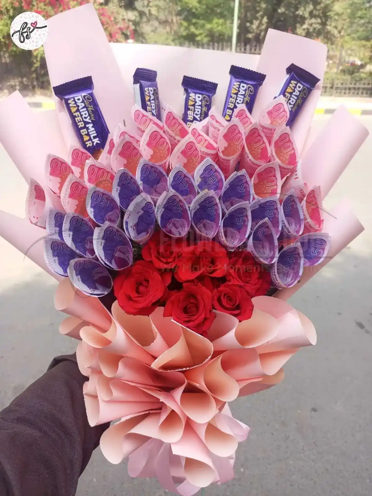 Money bouquet with flowers and chocolates — a luxury currency gift arrangement perfect for birthdays, weddings, graduations, and premium surprise gifting.