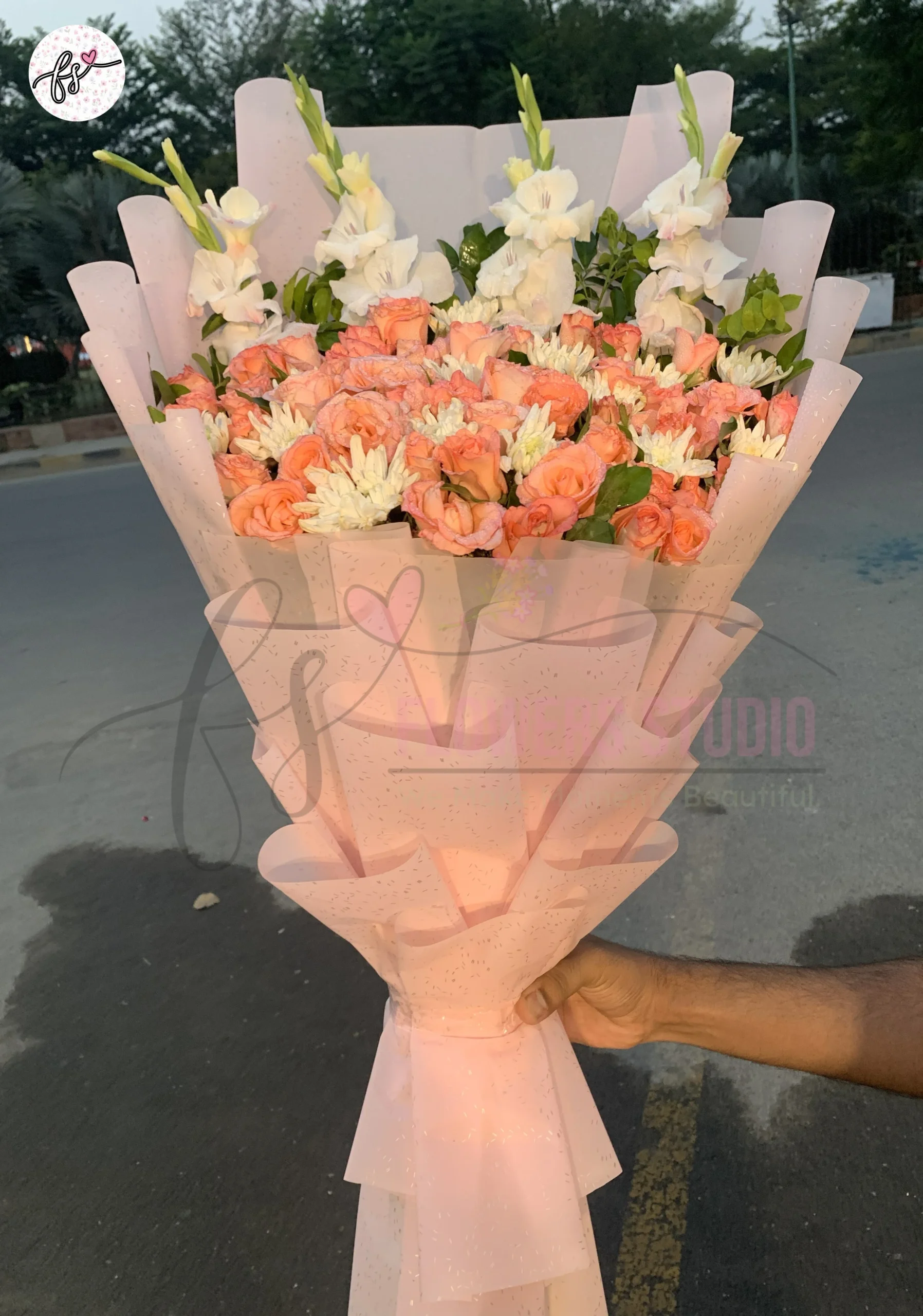 Express elegance and charm with this beautifully arranged bouquet featuring fresh pink roses paired with graceful white gladiolus. Wrapped in a soft peach color, this bouquet offers a delicate and sophisticated look that is perfect for meaningful gifting.