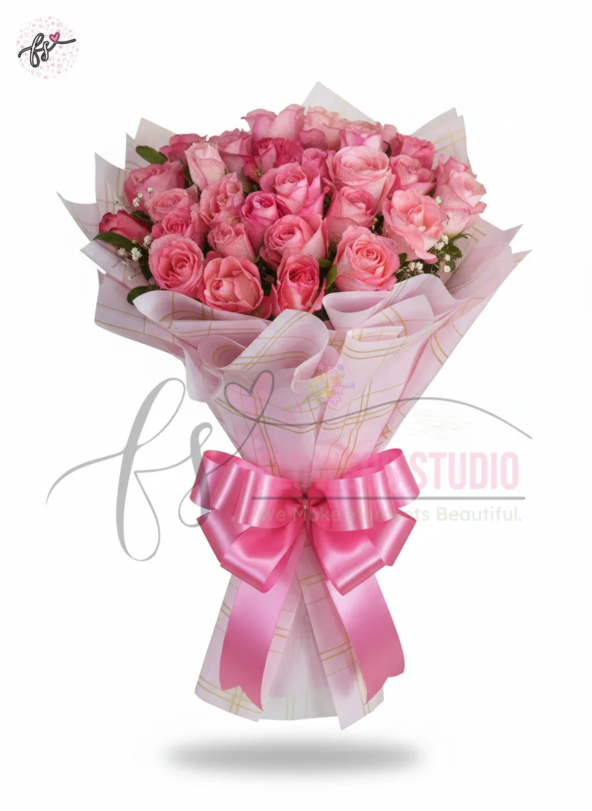 The Pretty Pink Circle Roses Bouquet Faisalabad is a delicate and elegant arrangement of fresh pink roses, beautifully crafted in a circular shape and wrapped in soft pink paper. Made by expert florists at Flowers Studio Faisalabad, this bouquet exudes charm and romance.