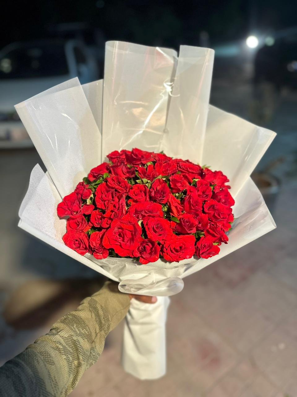 A grand bouquet of fresh red roses accented with delicate baby’s breath, beautifully arranged in black wrapping — perfect for birthdays, anniversaries, or romantic gifting.