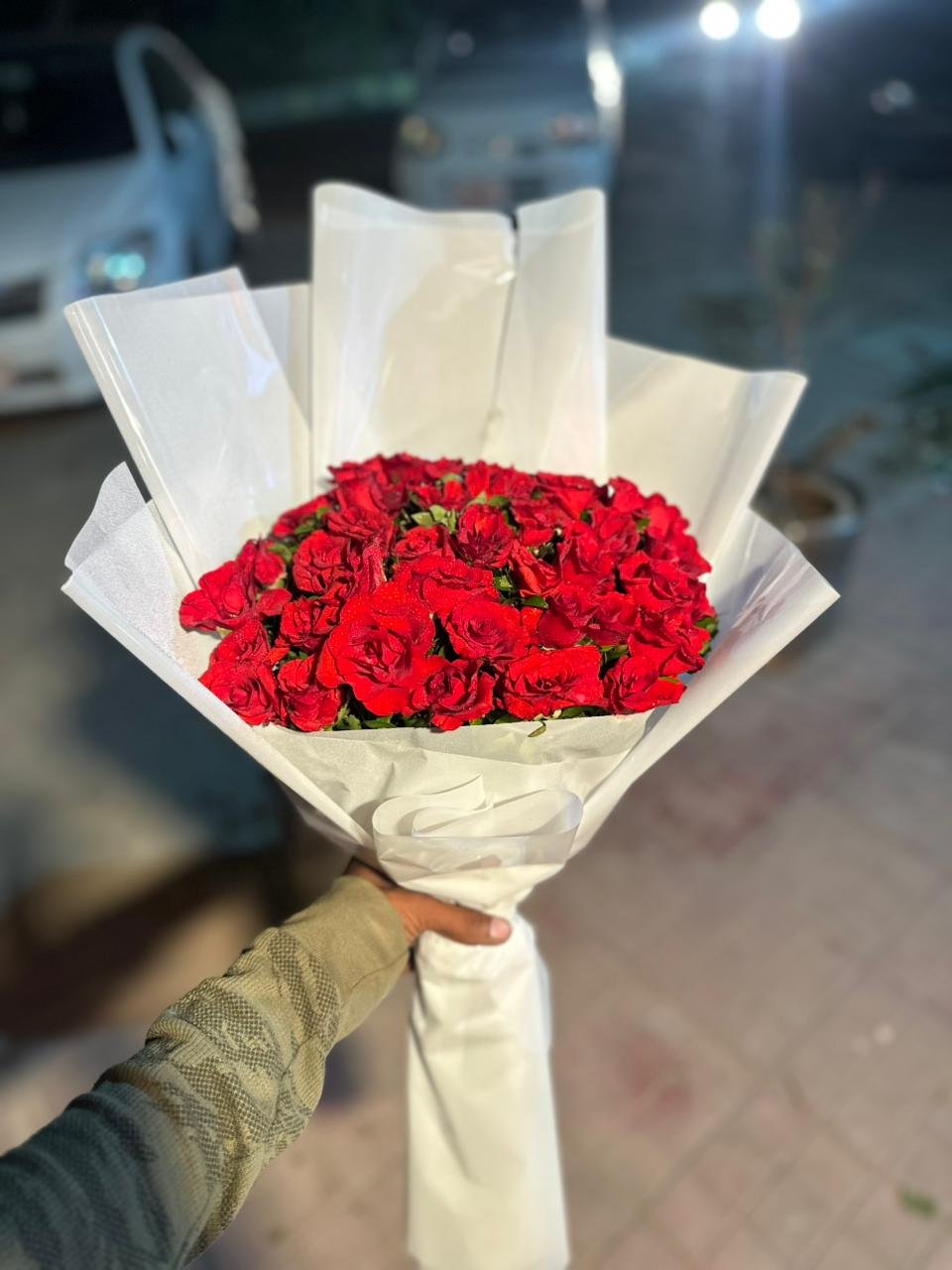 A charming bouquet of fresh red roses paired with delicate white flowers, elegantly wrapped in white paper — perfect for birthdays, anniversaries, or romantic gifting.