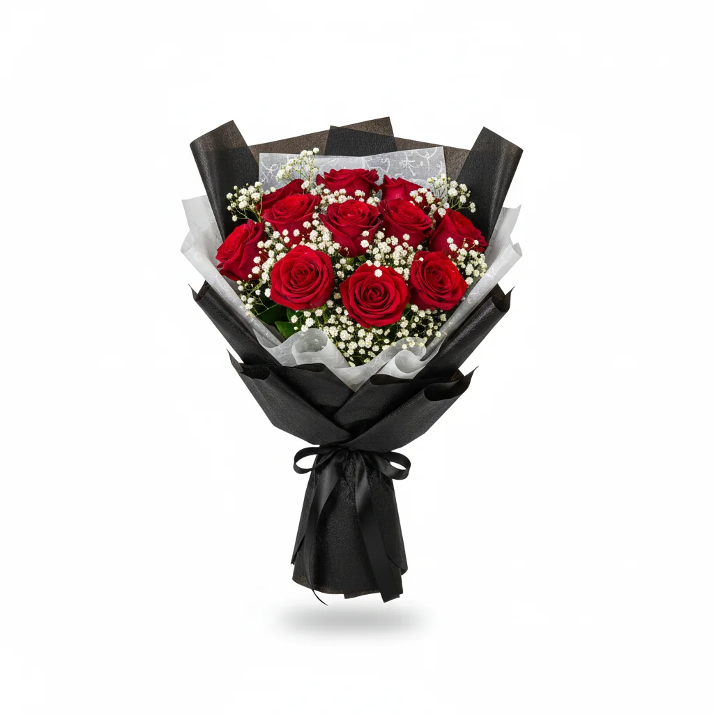 Make a lasting impression with this elegant bouquet of fresh red roses accented by delicate baby’s breath, wrapped in sophisticated black paper. This bouquet is perfect for romantic gestures, anniversaries, special celebrations, or as a corporate gift. The black wrapping adds a touch of luxury, making it suitable for gifting with style and elegance.