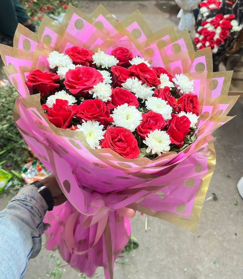 Celebrate your special moments with this stunning bouquet of fresh red roses accented with delicate white flowers, elegantly arranged with pink wrapping. This bouquet is a perfect choice for birthdays, anniversaries, romantic gestures, or any occasion where you want to express love and affection. Crafted with high quality with affordable price, it ensures long-lasting freshness and elegance.