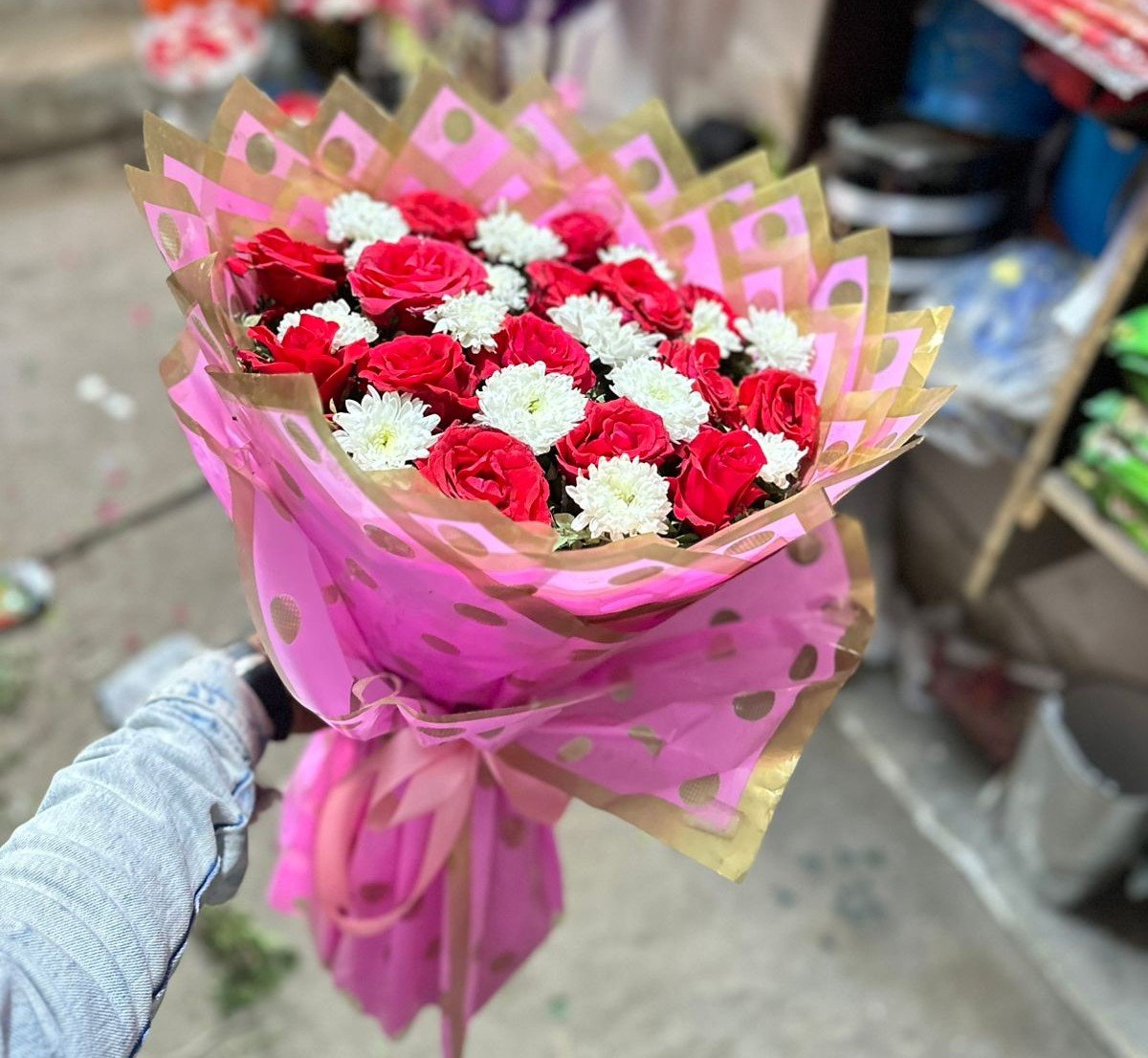 A beautiful bouquet of red and pink roses with white craze flowers and pink wrapping. High-quality, affordable, and perfect for birthdays, anniversaries, and romantic celebrations.