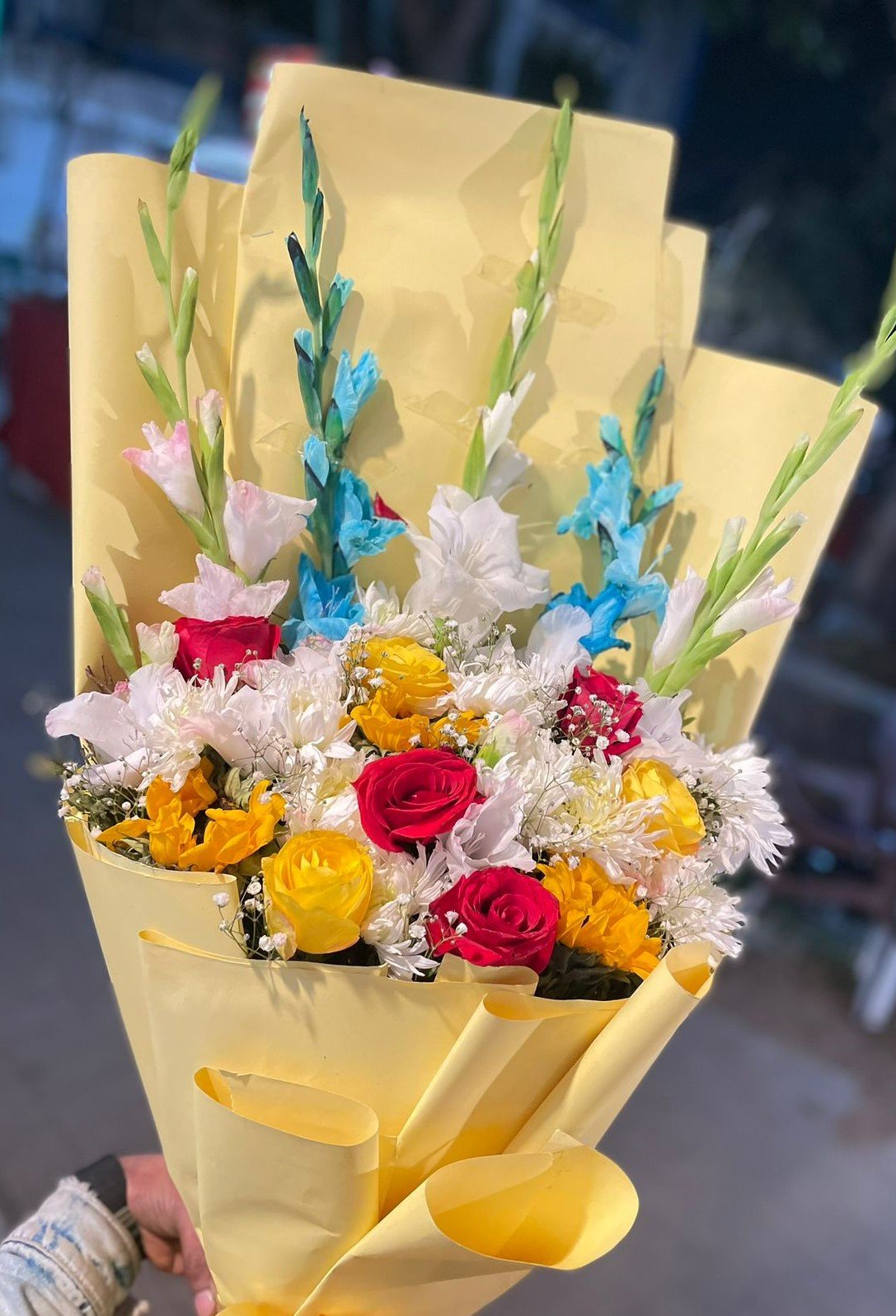 Brighten someone’s day with this colorful mixed bouquet of fresh red and white roses, complemented by purple and white gladiolus and soft baby’s breath. The golden wrapping adds a luxurious touch, making it a perfect gift for birthdays, anniversaries, congratulations, or special occasions. Crafted with high-quality flowers at an affordable price, this bouquet creates a stunning and long-lasting floral arrangement that impresses at first sight.