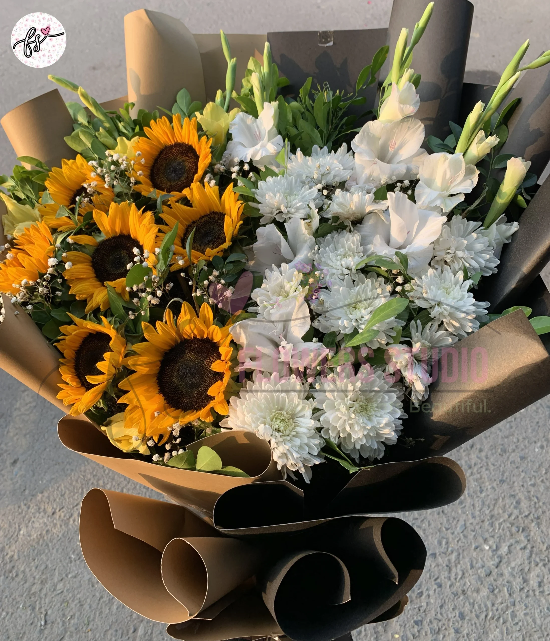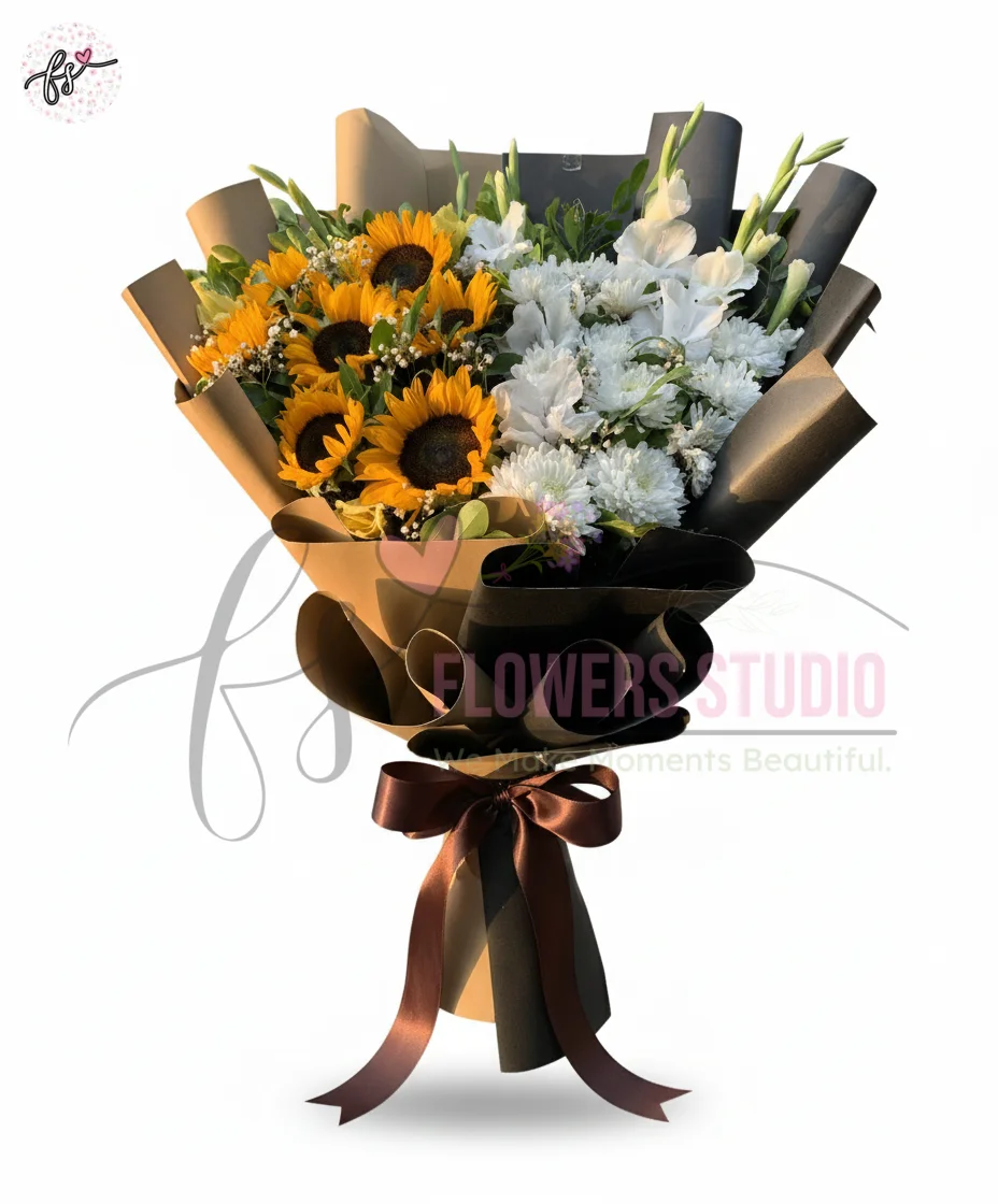 The Sunny Glow Sunflowers Bouquet Faisalabad is a vibrant and cheerful arrangement featuring fresh sunflowers combined with elegant white craze flowers. Wrapped beautifully in a stylish two-tone paper, this bouquet is handcrafted by Flowers Studio in Faisalabad for a fresh and premium gifting experience.