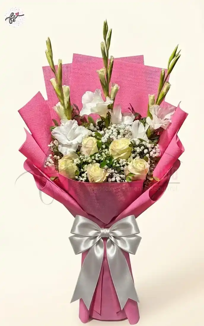 A white rose, white gladiolus, and baby’s breath bouquet in premium pink wrapping — elegant and fresh, perfect for weddings, birthdays, anniversaries, and special gifting at a high-quality and affordable price.
