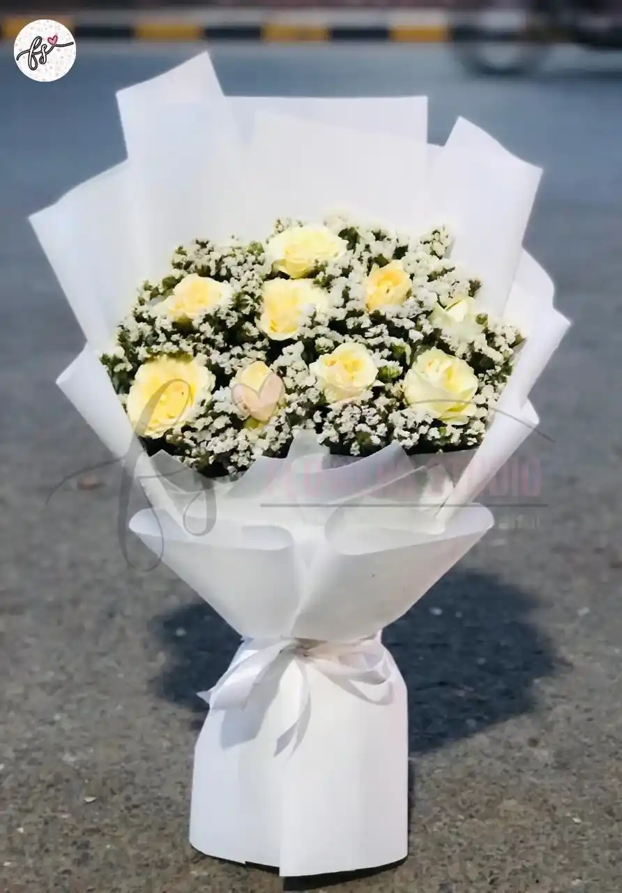 A white rose and statice stylish bouquet in elegant white wrapping — perfect for weddings, sympathy, and modern gifting at high quality and affordable price.